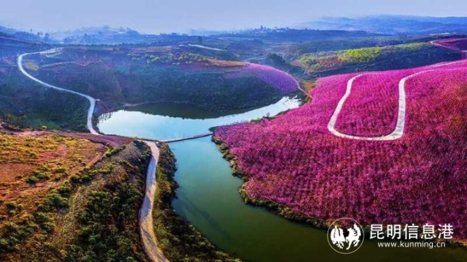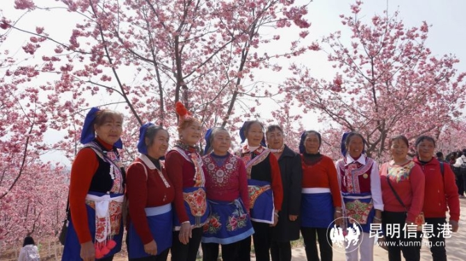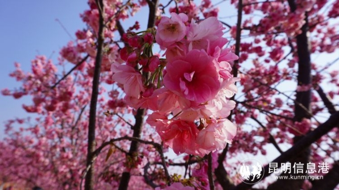 山后樱花谷始建于2005年,总面积达3800亩,目前共种植60余个品种的樱花37万株,每年12月底至次年4月下旬依次盛开,各品种搭配起来前后花期长达4个月,2019年接待游客120余万人,是昆明春季赏花的网红打卡点之一。