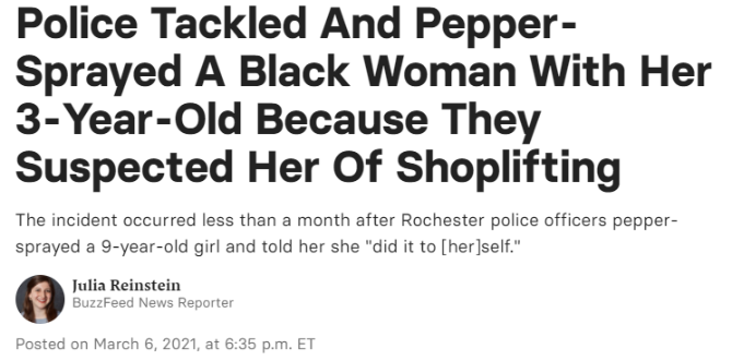 在罗切斯特市民间组织“警察问责委员会”(PAB)看来,这起事件和最新发生的事件存在“令人不安的相似之处”:都涉及非洲裔母亲和儿童;都涉及明显处于危机中的非洲裔美国人;都涉及警察对非洲裔母亲和儿童使用胡椒喷雾。在这两起事件中,警察都没有采取任何措施来缓解事态,而且都有明显的恐吓旁观者的行为。“如果没有这些旁观者的勇气,这两起事件可能永远不会曝光。”