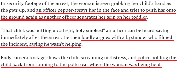 一名警察在用胡椒喷雾“制服”这名妇女的同时,另一名警察扯开了她抓住孩子的手;