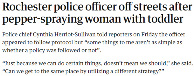这些细节同样触动了罗切斯特市警察局长辛西娅·赫里奥特-沙利文。她在视频公布后表示,此案中的警察看似并没有违反规定,但“有些事情不像政策是否被遵守这么简单”,“仅仅因为我们可以做某些事情,就意味着我们应该去做吗?我们能不能使用不同策略来达到同样目的呢?”