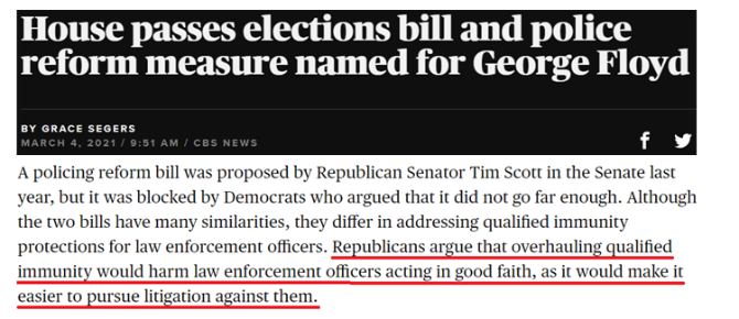 上周,美国国会众议院曾以微弱多数的表决结果,通过了一项旨在防止警察执法不当的法案,并将其命名为《弗洛伊德警察执法公正法案》。目前,该法案正在等待参议院审议。尽管本届参议院中民主党人占优,但法案若想获得参议院通过仍需得到绝对多数支持,而目前看来,前景并不那么乐观。