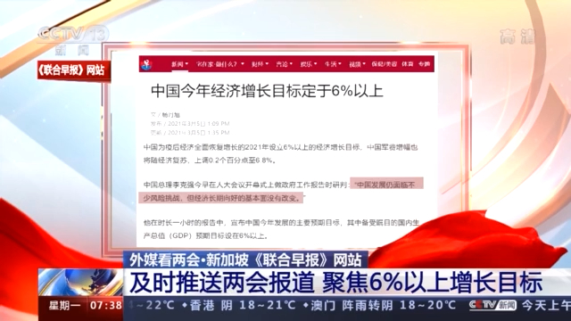 新加坡《联合早报》在网站上第一时间推送两会报道。报道称,中国政府工作报告谈到:“中国发展仍面临不少风险挑战,但经济长期向好的基本面没有改变。”中国为疫后经济全面恢复增长的2021年设立6%以上的增长目标。