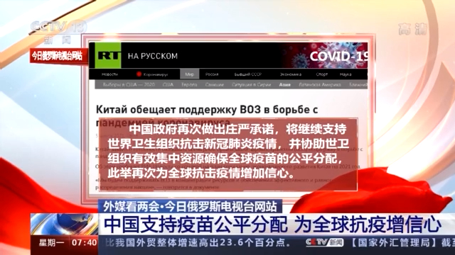 今日俄罗斯电视台网站的报道注意到,中国政府再次做出庄严承诺,将继续支持世界卫生组织抗击新冠疫情,并协助世卫组织有效集中资源确保全球疫苗的公平分配。报道评论称,此举再次为全球抗击疫情增加信心。