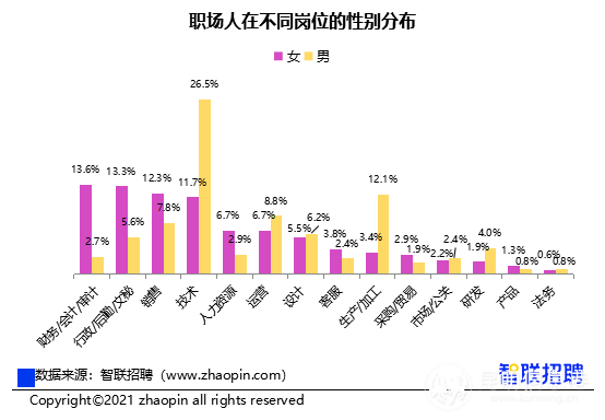 女性薪酬低于男性,除了管理层占比偏低,还在于女性主要从事的岗位普遍缺少高薪属性。从本次调研数据来看,女性主要分布在财务、行政、人力资源和销售岗,现在普遍高薪的技术、产品岗位上男性的占比优势明显。
