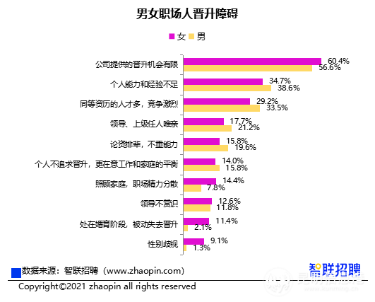 在晋升障碍方面,两性也存在一些基于性别和婚育的差异。男性晋升障碍多归结于个人能力、上级领导、同级竞争、公司制度等与职场相关度高的原因,而女性在“照顾家庭,职场经历分散”、“处在婚育阶段,被动失去晋升”、“性别歧视”三个选项的占比,远高于男性职场人。