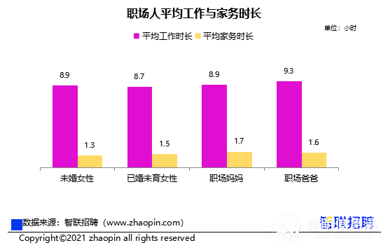 职场妈妈的平均工时为8.9小时/日,低于职场爸爸的9.3小时。与此同时,职场妈妈平均每天用1.7个小时做家务,为所有职场群体中用时最多。