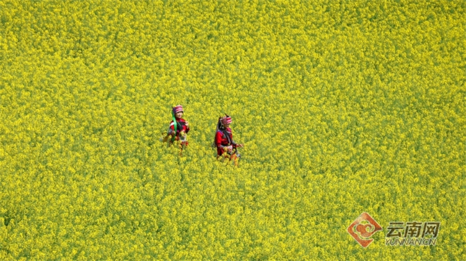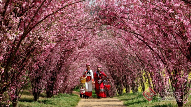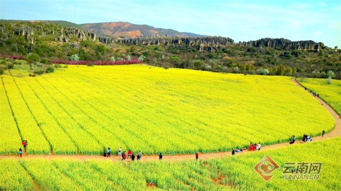 人间三月,乃古春花。三月是烂漫的季节,也是乃古石林最好的时节。满山满谷的油菜花开了,蜂飞蝶舞,明媚的金黄色铺天盖地,照亮了巍峨的黑石城堡。秾丽的海棠花开成了十里红妆,仿佛漫天云锦落在大地上,铺陈出一条浅粉深黛的鲜花遂道,人们都说,走过这条绚丽的花道,就走进了春天。