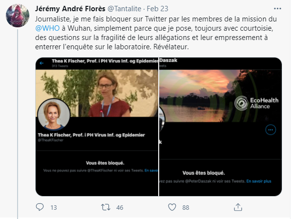 图为法国《观点》杂志的反华记者Jérémy André Florès和他在境外社交平台“推特”上被多名国际病毒专家拉黑的截图