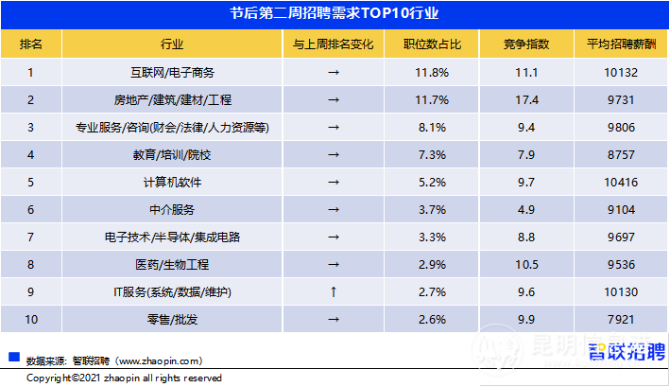 延续节后首周趋势,互联网/电子商务、房地产/建筑/建材/工程仍是招聘需求最高的行业,招聘需求规模分别占11.8%、11.7%。本周进入招聘需求TOP10的行业为IT服务(系统/数据/维护),该行业整体招聘规模占比扩张的同时,求职端活跃程度更高,带动竞争指数环比上升1.5。
