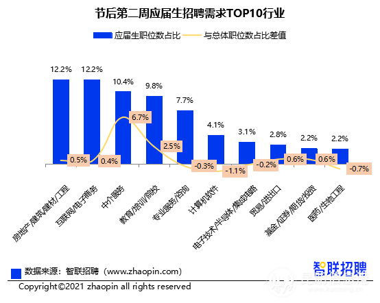应届生招聘需求规模前10的行业中,房地产/建筑/建材/工程、互联网/电子商务的招聘需求最为旺盛,招聘职位数占比均为12.2%。其次是中介服务(10.4%),教育/培训/院校(9.8%),这两个行业对年轻人才的需求更高,面向应届生的职位数分别较招聘市场总体水平高出6.7和2.5个百分点。其中,涵盖K12教育、职业培训等多方面的在线教育,自疫情以来就热度不减,也带动教培行业整体招聘需求旺盛。
