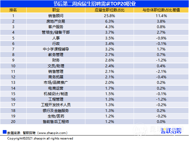 在招聘需求最高的前20个职业中,销售类岗位为大学毕业生开放岗位最多,销售顾问一职招聘需求独大,其应届生招聘职位数占比达25.8%,并且比该行业在整体招聘市场的职位数占比高出11.4%,房地产交易以6.3%的招聘职位数占比排在其后。