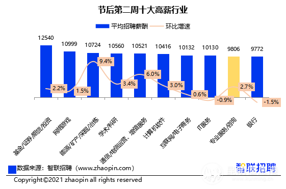 从行业角度看,位于排名前列的基金/证券/期货/投资和网络游戏行业,与上一周名次保持一致,在节后第二周的平均招聘薪酬分别达到12540元/月与10999元/月。