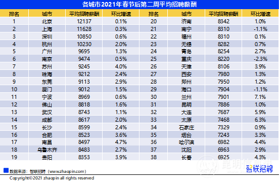 节后第二周全国平均招聘薪酬有所提升