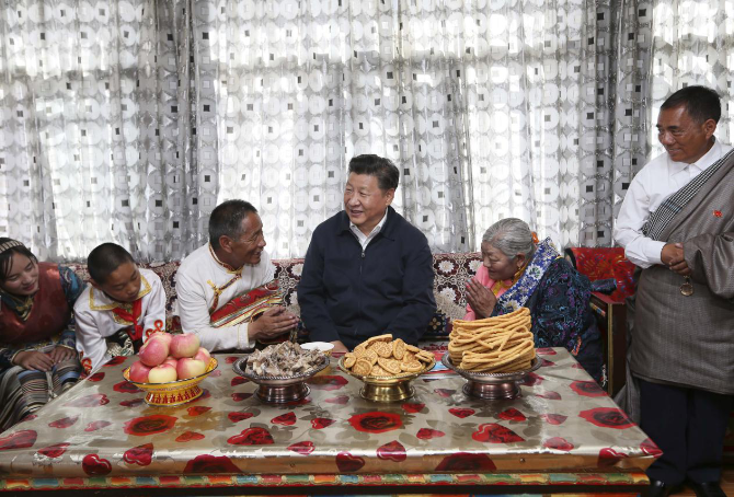 2016年8月22日,习近平总书记在青海省海西蒙古族藏族自治州格尔木市唐古拉山镇长江源村藏族村民申格家中同一家人亲切交谈。