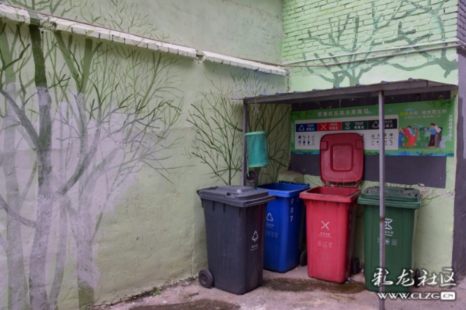 这也是官渡区太和街道居民楼前的垃圾分类箱,周围的墙上还画了彩绘,整个环境十分协调,给人耳目一新的感觉。