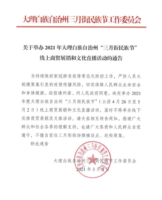 3月9日,大理州三月街民族节委员会发布通告,决定举办2021年度大理白族自治州“三月街民族节”(公历4月26日至5月2日)线上商贸展销和文化直播活动,届时不再举办线下实体商贸展销及文体活动。