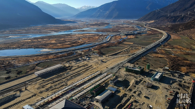 △2020年12月31日,西藏林芝,中铁十一局施工人员庆祝川藏铁路拉萨至林芝段轨道全线铺通。