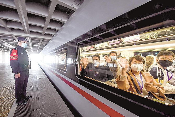 去年3月19日,湖北首批免费复工返岗专列G4318次“点对点”输送1631名荆州人到广东返岗。(湖北日报全媒记者 陈勇 摄)