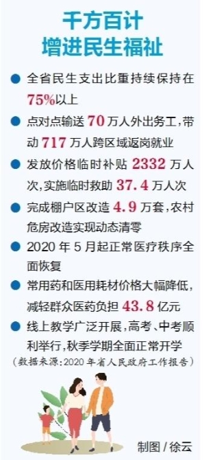 看就业保障——全省点对点输送70万人外出务工,带动717万人跨区域返岗就业,援企稳岗660万个次,开发扶贫公益岗位31.4万个;多渠道多方式帮助高校毕业生、退役军人等重点群体就业。