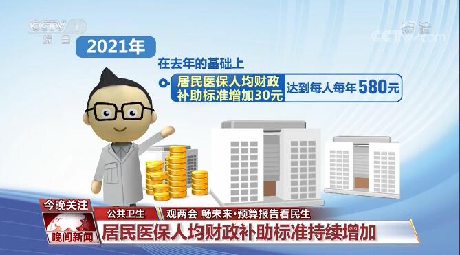 公共卫生投入也将强化。预算报告指出,2021年居民医保人均财政补助标准增加30元,达到每人每年580元。对医保基金负担的新冠病毒疫苗及接种费用给予补助,支持实施居民免费接种政策。