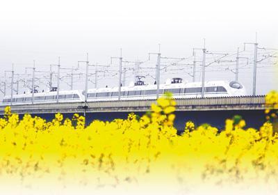 江西省峡江县水边镇义桥村,列车从油菜花丛中疾驰而过。徐铮摄(人民视觉)