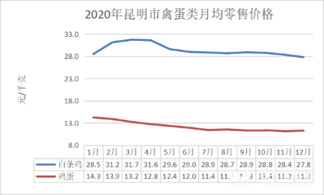 禽类市场需求扩大,价格较2019年相比上涨。蛋类供应增加,市场需求减弱,蛋类价格较2019年相比下跌。全市白条鸡平均零售价格为29.43元/千克,环比上涨29.9%。鸡蛋平均零售价格为12.23元/千克,环比下跌2.8%。