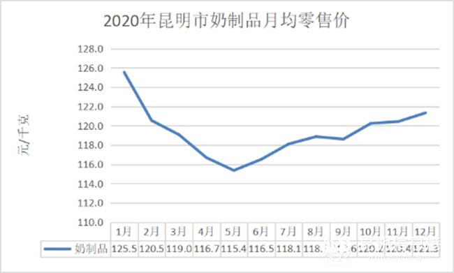 2020年,奶制品市场需求旺盛,价格较2019年相比小幅上涨。全市奶制品平均零售价格为119.27元/千克,环比上涨6.7%。其中,酸奶平均零售价格为17.41元/千克,环比上涨31.4%;婴幼儿奶粉平均零售价格为284.63元/千克,环比上涨6.7%;牛奶平均零售价格为15.37元/升,环比上涨4.8%;中老年奶粉平均零售价格为98.23元/千克,环比上涨4.3%。