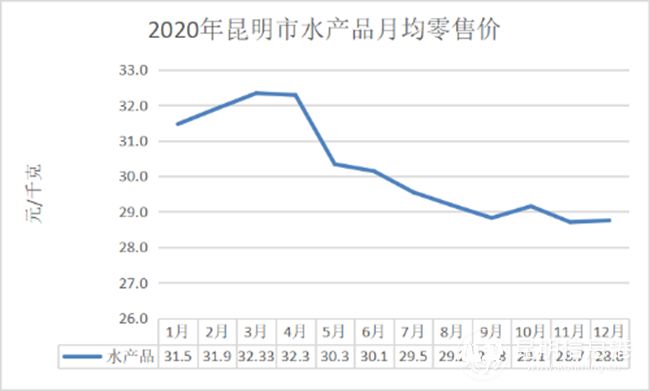 水产品市场需求减弱,价格较2019年下跌。2020年,全市水产品平均零售价格为30.22元/千克,环比下跌4.3%。其中,鲫鱼平均零售价格为23.48元/千克,环比上涨14.4%;草鱼平均零售价格为19.68元/千克,环比上涨8.7%;鲤鱼平均零售价格为19.57元/千克,环比下跌0.8%;大黄鱼平均零售价格为51.81元/千克,环比下跌4.3%;鲢鱼平均零售价格为20.1元/千克,环比下跌7.6%;大带鱼平均零售价格为45.93元/千克,环比下跌16.8%。