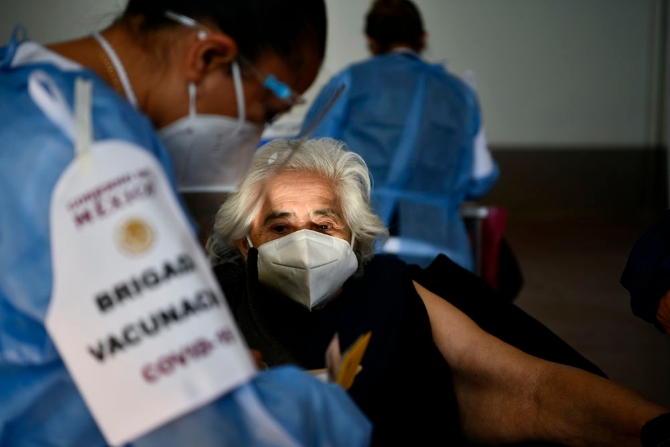 3月9日,墨西哥伊达尔戈州阿卡克索奇特兰的居民在一处新冠疫苗接种点接种疫苗。