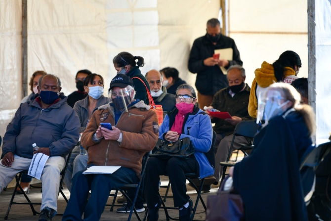 3月9日,人们在墨西哥伊达尔戈州阿卡克索奇特兰一处新冠疫苗接种点等待。