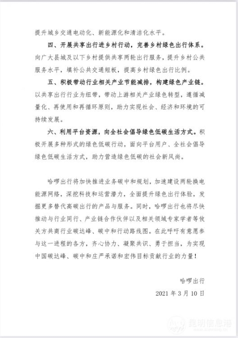在今年全国两会上,碳达峰、碳中和被首次写入政府工作报告,令这一中国对世界的庄严承诺再次成为热点话题。3月10日,专业移动出行平台哈啰出行发布共享出行行业内的首份碳中和倡议书,呼吁共享出行行业、产业链合作伙伴及相关领域专家学者共商行业碳达峰、碳中和行动路线图,为实现中国“双碳”目标贡献行业力量。