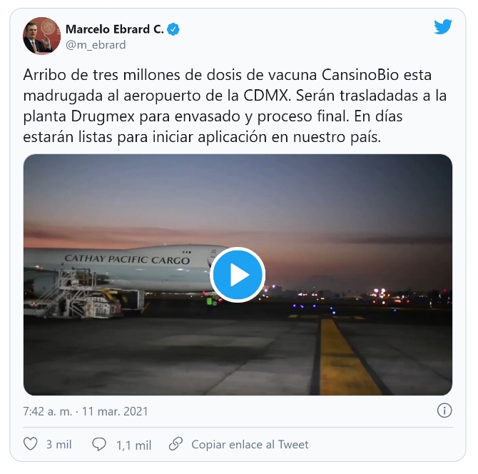 当地时间3月11日凌晨,一批来自中国的康希诺新冠疫苗原液抵达墨西哥首都墨西哥城国际机场。墨西哥外长埃布拉德通过社交媒体平台透露,这批疫苗原液在本地进行分装处理后将于本月底前投入使用。