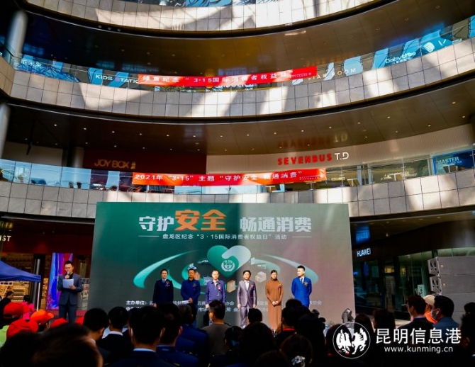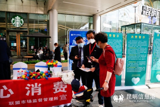昆明信息港讯 记者徐毅杰 为深入贯彻落实党的十九大精神,切实做好消费者权益保护各项工作,营造良好的消费环境,推动消费畅通,促进经济社会健康发展。3月12日,“守护安全畅通消费”盘龙区2021年纪念“3·15国际消费者权益日”年主题现场宣传活动在同德昆明广场举行。