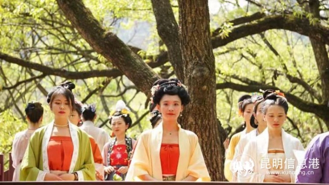 花朝节,也叫花神节,是汉民族的传统节日之一,民间俗称“百花生日”。花朝节期间,汉服爱好者们总是自愿自发地穿上汉服,一同结伴到郊外园林春游赏花。还有一些地方的习俗,姑娘们会剪五色彩纸粘在花枝上,称为“赏红”。3月13日,辛丑年花朝节,正值黑龙潭公园第十九届昆明杜鹃花节开展前夕,云南承韵汉服社与昆明市黑龙潭公园一起举办了花朝游园活动。汉服爱好者们身着华服,畅游花海,享尽人间春色。现场还在公园内杜鹃谷观景台上组织了拜花神活动,此时,山谷中的杜鹃已进入初花期,12位花神在阳光灿烂的3月里,与数十名汉服爱好者们共同祈福花朝,共赏春花。