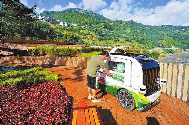 游客在小沙坝服务区体验无人售货车服务。云南腾云信息产业有限公司 供图