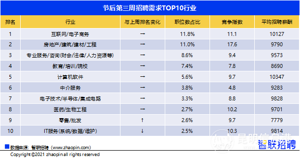 智联招聘近日发布《2021年春招市场行情周报》第三期,监测周期为3月4日至3月10日。其中指出,本周就业市场竞争指数为10.2,招聘薪酬为9182元/月,均与上周持平,医生/药剂师薪酬上涨8.6%,以11420元/月进入高薪榜单,昆明平均招聘薪酬7916元,环比增速为0.4%。零售/批发行业招聘需求排名上升,前端开发等技术岗竞争热度继续蹿升,北京稳居求职热度首位。