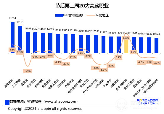 虽然环比增速有所放缓,但能源/矿产/采掘/冶炼行业本周依然以5.2%的薪酬增速成为亮眼行业,并以11282元/月的薪酬上升至全行业第二名。企业高级管理人才仍高居高薪行业之首,平均招聘薪酬为21814元/月;此外,以人工智能为首的技术岗位,以及投融资等金领的招聘薪资也持续占据拔尖地位。医生/药剂师也异军突起,薪酬环比增速达到8.6%,与其他职业拉开鲜明差距,并以11420元/月的薪资上榜本周高薪职位第16名。