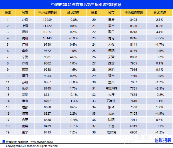 在全国38个核心城市中,北京、上海、深圳、杭州依然占据全国薪酬领先地位,其中上海、深圳两地的薪酬较上一周还有小幅上涨趋势。从薪酬增速角度来看,宁波、海口平均招聘薪酬在节后第三周分别环比上升4.6%、4.4%,重庆(2.3%)、济南(2.2%)、烟台(1.7%)、长沙(1.7%)紧随其后。昆明平均招聘薪酬7916元,环比增速为0.4%。
