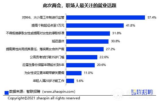 本监测周期正值全国两会召开,周报也对会上的一些热点话题进行了调研,其中,57.4%的受访者对“监管996工作制”表示关注;41.8%的受访者关心“提高个税起征点至1万元”的话题;而“不得拒绝录取女性或提高对女性的录取标准”与“延迟退休”,也都获得超过3成的关注;对“应届生身份保留年限延长到5年”这项提案,受访者中有20.6%的予以关注。