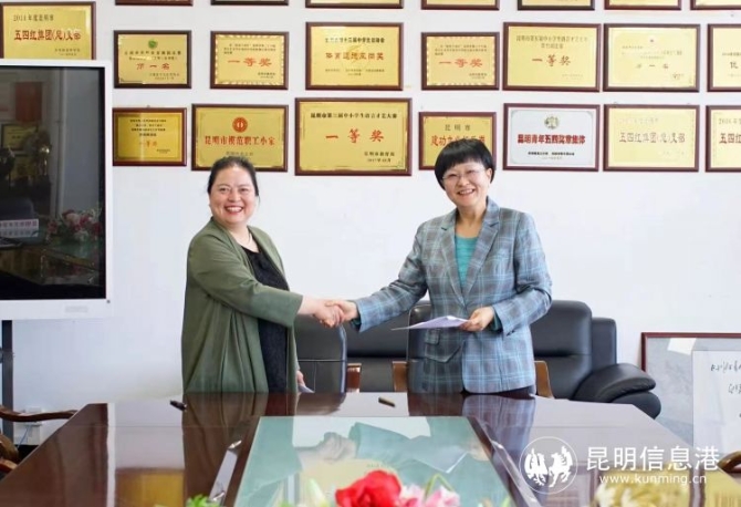 昆明市艺术学校校长李琪(图右)、靳丽芬教授签署聘用协议