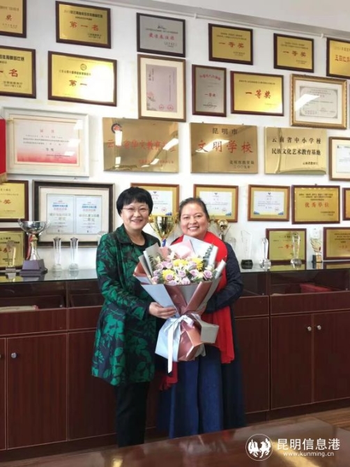 昆明市艺术学校校长李琪(图左)向靳丽芬教授赠送鲜花