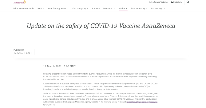 阿斯利康公司于3月14日声明表示,在对英国和欧盟超过1700万名接种者的所有可用安全数据进行仔细审查后,在任何年龄段、性别、接种批次或任何特定国家与地区,都没有发现接种导致肺栓塞、深静脉血栓形成或血小板减少等风险上升的证据。