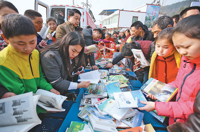 图为四川旺苍县普济镇天台村的村民,在挑选“走”来的图书。陈绍海摄