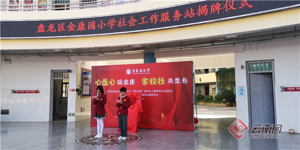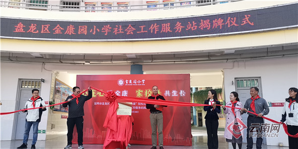 3月18日,昆明市盘龙区金康园小学“社会工作服务站”揭牌仪式在校园内举行。这也是云南首家进驻小学的社会工作服务站,将面向学校、老师、家长,通过开展教育课堂、主题活动、午间小组活动、课间个别化咨询、个案辅导等活动,努力在学校教育、家庭教育、与社会教育之间形成更好合力,协助学生开发潜能,助力学生健康成长。