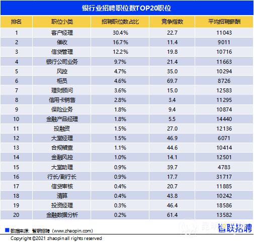 银行业招聘需求中客户经理占比超3成,合规稽查、金融风控、信贷审核、清算等后台岗位的招聘需求排名也整体靠前。而金融业与互联网的接轨,带动金融产品经理进入银行业核心招聘职业TOP20。该岗位对金融与互联网的知识技能有着刚性要求,14440元/月的薪酬也很丰厚,仅次于18586元/月的投资经理。金融产品经理竞争较为缓和,平均有5.5人争抢一职。