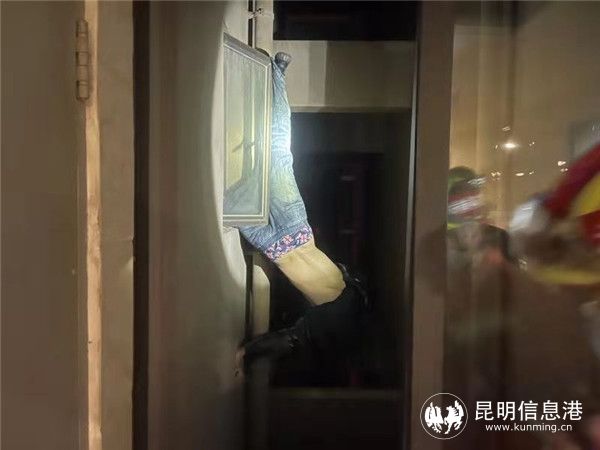 3时53分,消防救援人员赶到现场,经现场侦查和询问得知,该男子喝醉酒从11层自家卫生间厕所窗户翻出来,万幸倒挂在10层住户厕所墙外开着的窗子上。只见该男子身体处于建筑外墙,倒悬于30余米高空,左脚牛仔裤裤脚挂在窗子角落上,右脚被群众从窗户里拉住,随时有可能坠落的风险,情况十分紧急。