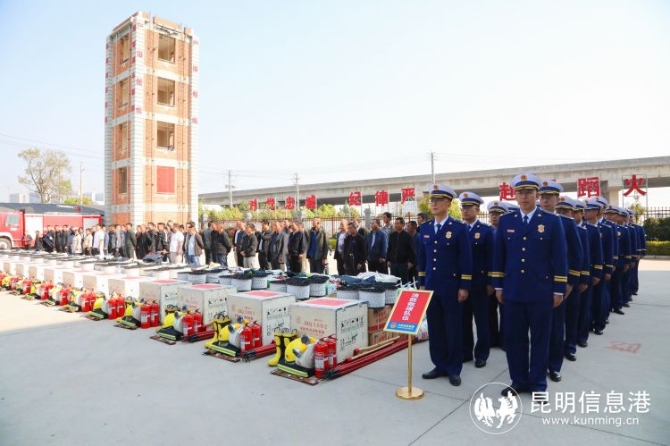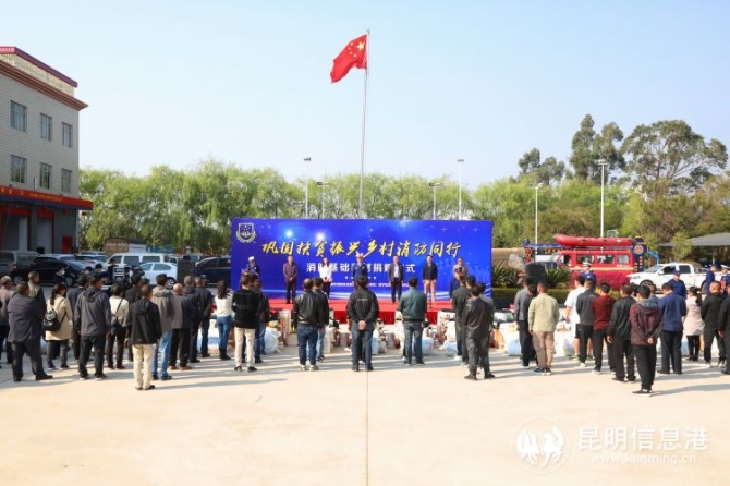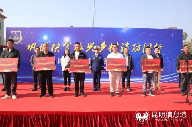 昆明信息港讯 记者劳学丽 通讯员杨坤会 3月18日,昆明市消防安全委员会在晋宁区举行“巩固扶贫振兴乡村消防同行”消防基础器材捐赠仪式,昆明市消防救援支队副支队长张尚海、晋宁区政府副区长陈海清及昆明市发展和改革委员会、农业农村局、住房城乡建设局、自然资源规划局等部门和部分县(市、区)消防救援大队、全市20个传统村落相关负责人共计100余人参加了仪式。