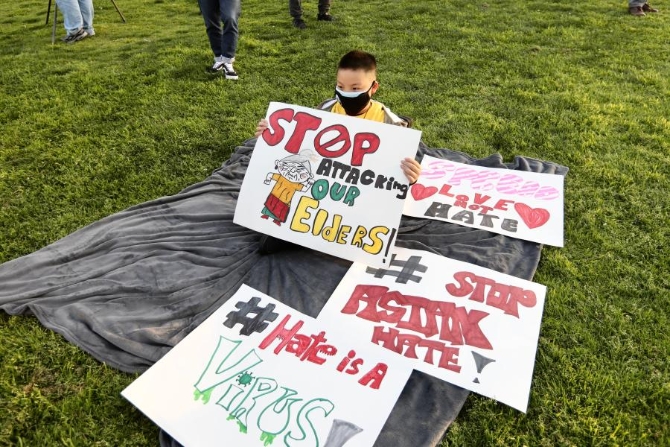 3月20日,一名男孩手持标语参加美国加利福尼亚州洛杉矶县阿尔汉布拉市举行的“停止仇恨亚裔”烛光仪式,抗议针对亚裔的暴力和仇恨犯罪。新华社发