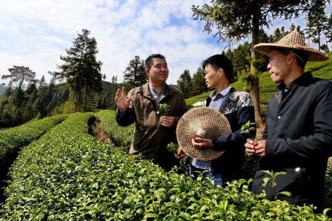 2019年3月26日,在福建省武夷山市星村镇,科技特派员与茶农在生态茶园内了解茶叶长势。新华社记者 安希雅 摄