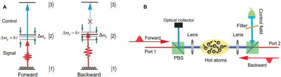 史保森教授、丁冬生教授等人一直致力于光与原子的相互作用的研究,利用克尔非线性效应在实验上实现了无腔的光学隔离器和环形器,证明了利用热原子气室可以实现弱光下的四通道光学环形器。在此基础上,他们开展了单光子条件下的非互易研究:利用冷原子系统产生了标记单光子,并将单光子作为信息载体入射到热原子隔离器,基于电磁感应透明和拉曼跃迁两种机制实现了真实单光子的双向非互易传输,隔离度为22.5+/-0.1dB,带宽达数百兆赫兹。除此之外,他们还实现了多频段复用的光学非互易,从而拓展了可实现非互易的信号频段范围。